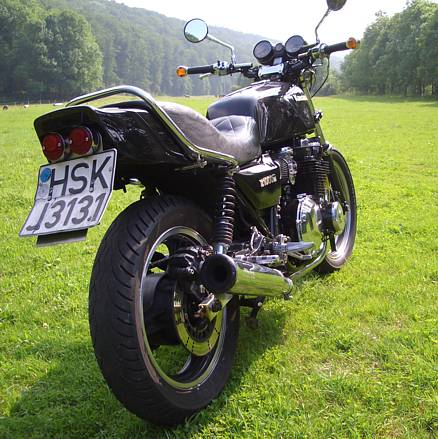 Hinterrad UT, Schwinge KJK, Bremsstabi Edelstahl Eigenbau, Rasten Raask, Rückleuchten Eigenbau Edelstahl, Sitzbank umgepolstert Bezug Eigenbau, Dämpfer hi. Koni, Bremsleitungen Telefix, Motor